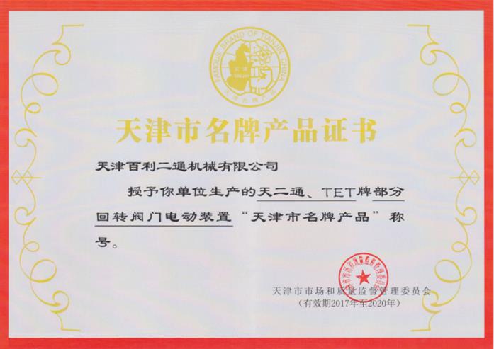 部分回轉(zhuǎn)閥門電動裝置名牌產(chǎn)品證書